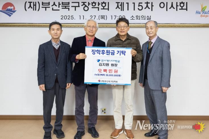 뉴스펀치 김길룡 기자 | 부산 북구는 최근 한사랑내과병원 김지원 원장이 (재)부산북구장학회에 장학기금 500만 원을 기탁했다고 밝혔다.