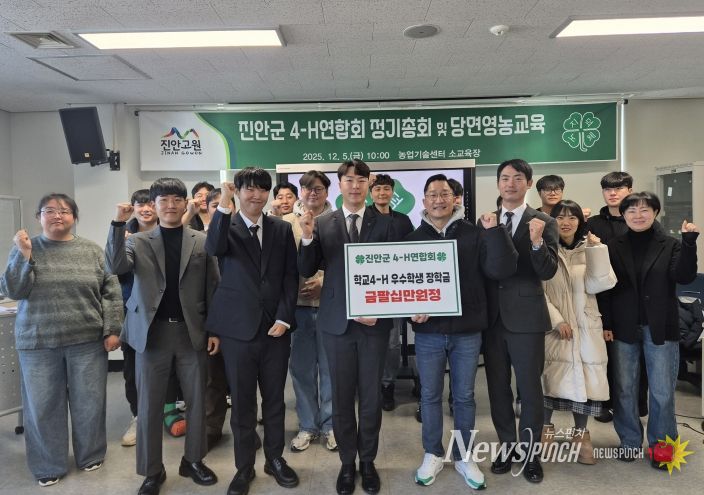 뉴스펀치 정홍균 기자 | 진안군 4-H연합회는 5일 진안군 농업기술센터 3층 소교육장에서 열린 정기총회에서 학교4-H 우수회원 8명에게 장학금을 전달했다. 장학생은 지난 1년간 4-H 과제활동과 농촌문화탐방교육 등 다양한 활동을 성실히 수행하고, 학교생활 전반에서 우수한 평가를 받은 학생들로 선발됐다.