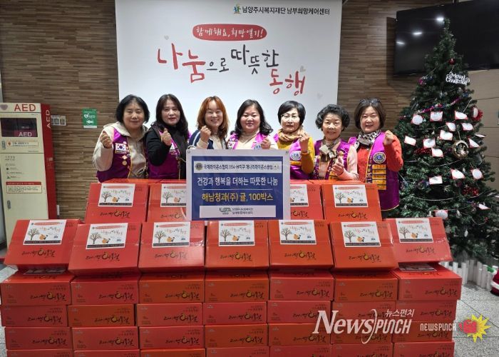 뉴스펀치 김길룡 기자 | 남양주시는 12월 2일 국제라이온스협회 354-H지구 개나리라이온스클럽이 지역 내 복지취약가정을 위해 5kg 귤 100박스(160만 원 상당)를 남양주시 남부희망케어센터에 후원했다고 밝혔다.