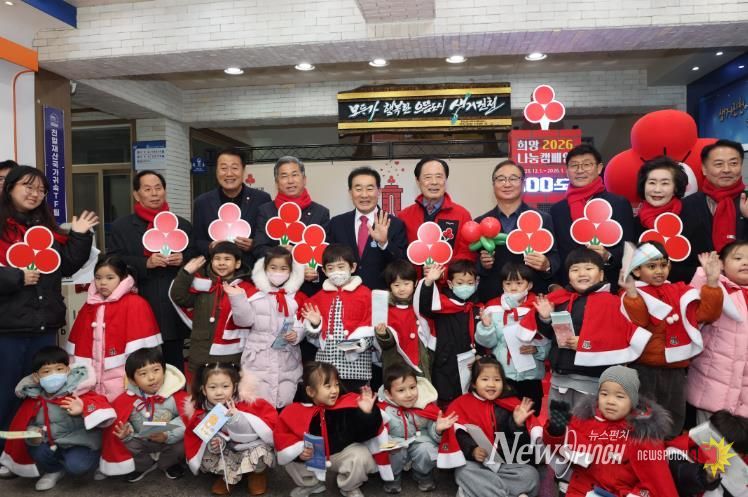 뉴스펀치 김길룡 기자 | 충북 진천군은 5일 진천군청 중앙현관에서 충북사회복지공동모금회와 함께 ‘희망2026나눔캠페인’ 사랑의 온도탑 제막식과 현장순회모금 행사를 개최했다.