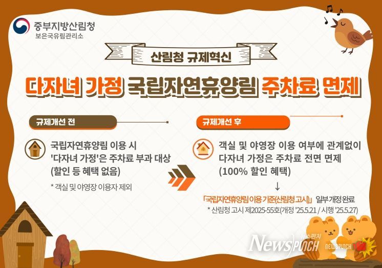 이에 따라, 산림청에서는'국립자연휴양림 이용 기준(산림청 고시)'을 일부 개정하여 객실 및 야영장 이용 여부와 관계없이 다자녀 가정은 주차료를 전면 면제받는 혜택을 누릴 수 있게 됐다.