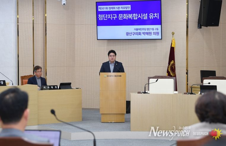 뉴스펀치 김길룡 기자 | 박해원 광산구의원(더불어민주당, 첨단1·2동)이 5일 열린 제301회 광산구의회 정례회 제2차 본회의에서 지속가능한 지역 성장 방안으로 ‘첨단지구 문화복합시설’ 유치를 제안하는 5분 자유발언을 펼쳤다.
