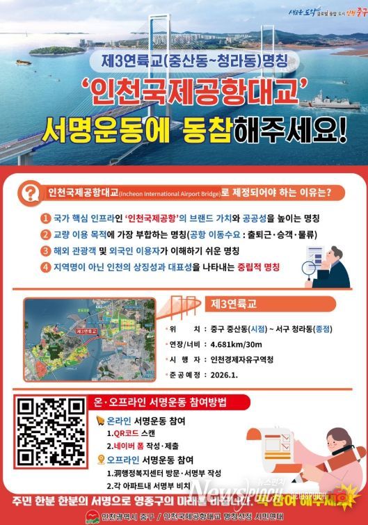 김정헌 중구청장은 “향후 국가지명위원회 재심의를 통해 제3연륙교 명칭이 ‘인천국제공항대교’로 관철될 수 있도록, 모든 행정 역량을 집중해 적극 대응해 나갈 방침”이라고 밝혔다.