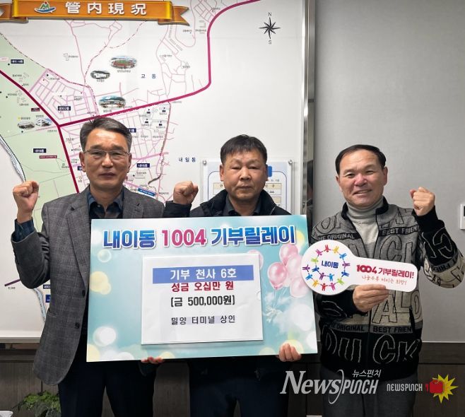 뉴스펀치 김길룡 기자 | 밀양시 내이동은 5일 밀양시외버스터미널 상인들로부터 지역 내 어려운 이웃들을 돕기 위해 성금 50만 원을 기탁받았다.