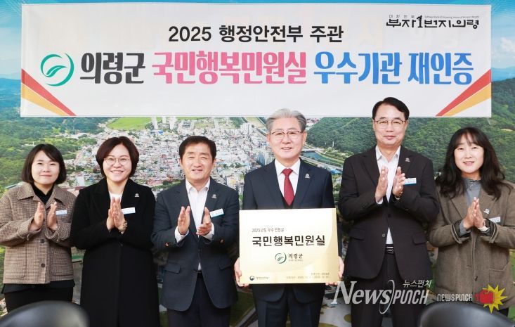뉴스펀치 김길룡 기자 | 의령군이 행정안전부가 주관하는 ‘국민행복민원실’ 재인증 평가에서 우수기관으로 선정됐다. 인증 기간은 2025년 12월 1일부터 2028년 12월 31일까지 3년간이다.