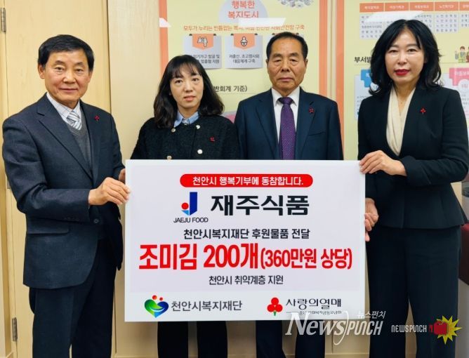뉴스펀치 김길룡 기자 | (재)천안시복지재단은 5일 재주식품이 취약계층을 위한 360만 원 상당의 별난맛김 200개를 후원했다고 밝혔다.