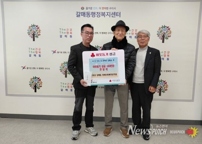 뉴스펀치 김길룡 기자 | 구리시는 지난 5일 오전 11시, 갈매동 행정복지센터에서 안여규 명예 사회복지 공무원이 연말을 맞아 갈매동 사회취약계층을 돕기 위한 후원금 100만 원을 기탁했다고 밝혔다.