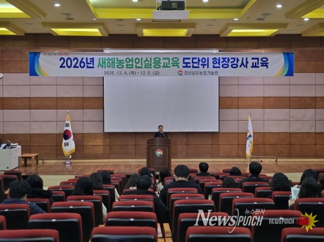 뉴스펀치 김길룡 기자 | 경상남도농업기술원은 12월 4일부터 5일까지 이틀간 미래농업교육관에서 도‧시군 농촌진흥공무원 100여 명을 대상으로 ‘2026 새해농업인실용교육 도단위 현장강사 교육’을 실시했다고 밝혔다.