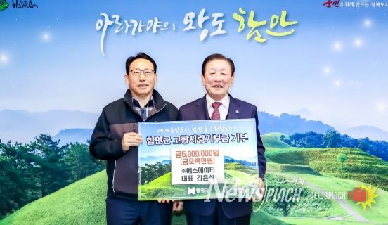 뉴스펀치 김길룡 기자 | 함안군은 지난 5일 대산면 소재 기업 에스에이티(SAT)가 고향사랑기부금 500만 원을 기탁했다고 밝혔다. 기탁식은 군청에서 열렸으며 조근제 함안군수와 에스에이티 대표 김윤석 등이 참석해 따뜻한 분위기 속에서 진행됐다.