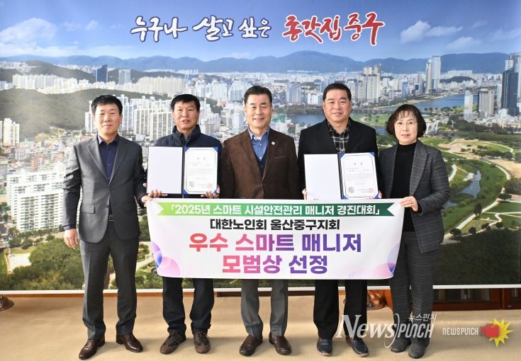 뉴스펀치 김길룡 기자 | 대한노인회 울산중구지회(지회장 최현만)에서 운영하는 ‘노인일자리 역량활용사업단’ 참여자 2명이 국토안전관리원과 한국노인인력개발원이 공동 주관하는 ‘2025년 스마트 시설안전관리 매니저 경진대회’에서 ‘우수 스마트 매니저’로 선정됐다.