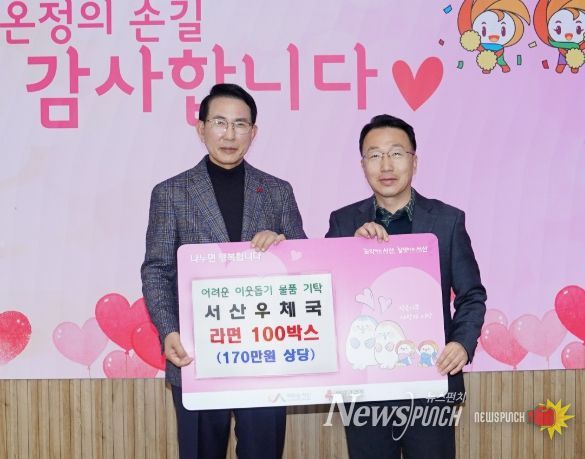 뉴스펀치 김길룡 기자 | 충남 서산시는 5일 서산우체국에서 어려운 이웃을 돕기 위해, 170만 원 상당의 라면 100박스를 기탁했다고 밝혔다.