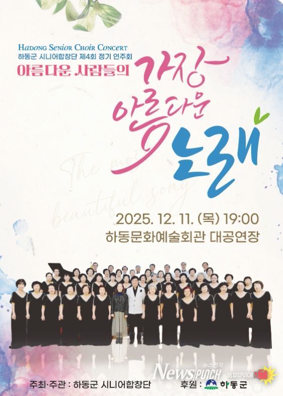 뉴스펀치 김길룡 기자 | 하동군시니어합창단(단장 강용기)이 오는 12월 11일 저녁 7시, 하동문화예술회관에서 ‘제4회 정기 연주회’를 개최한다. 깊어지는 겨울밤, 군민들에게 따뜻한 감동과 음악적 울림을 전하기 위해 준비된 연말 공연으로 많은 관심이 집중되고 있다.