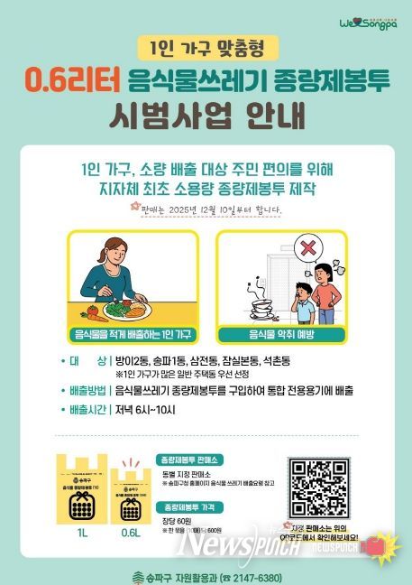 뉴스펀치 김완규 기자 | 서울 송파구가 전국 지방자치단체 최초로 1인 가구에 최적화된 0.6ℓ 규격의 음식물쓰레기 종량제봉투를 오는 10일부터 시범 도입해 운영한다고 알렸다.