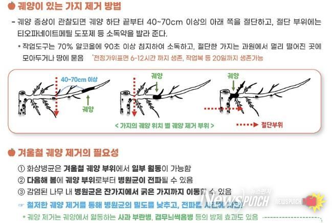 농업기술센터 관계자는 “의심 궤양 제거 시 발생 부위를 중심으로 하단 40∼70cm 이상을 절단하고 절단면에는 등록 약제를 고르게 도포해야 효과적”이라며 “작업 후 작업복과 전정가위, 톱 등 모든 작업도구는 철저하게 소독해 달라”고 강조했다.