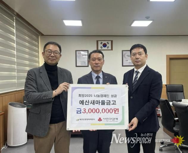 뉴스펀치 김길룡 기자 | 예산군 예산읍은 예산새마을금고가 예산읍 행정복지센터를 방문해 ‘희망2026 나눔캠페인’ 성금 300만원을 기탁했다고 8일 밝혔다.
