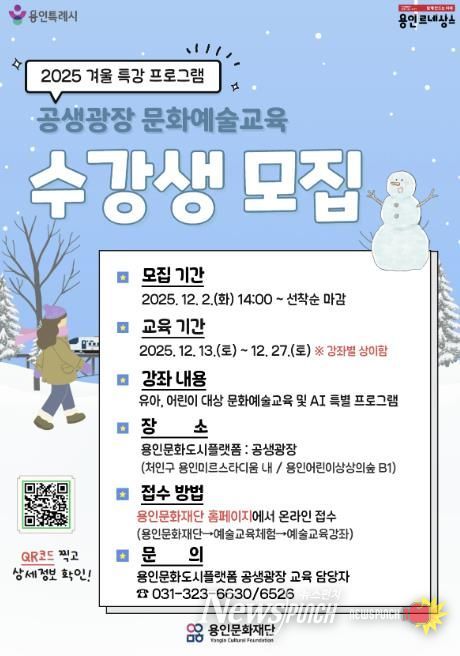 뉴스펀치 김길룡 기자 | 용인문화재단은 지난 12월 2일부터 '2025 용인문화도시플랫폼 공생광장 문화예술교육' 겨울 특강 수강생을 모집하고 있다. 이번 겨울 특강은 AI 프로그램 활용 교육을 포함해 총 12개의 인기 강좌로, 겨울방학 기간 유아·어린이들이 창의력을 마음껏 발휘할 수 있는 특별한 문화예술 체험 기회를 제공한다.