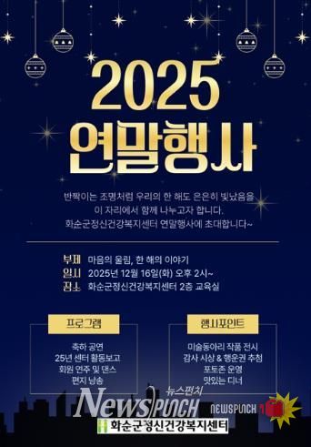 뉴스펀치 강영선 기자 | 화순군은 보은병원에 위탁 운영 중인 화순군정신건강복지센터가 '마음의 울림, 한 해의 이야기'를 주제로 오는 16일 오후 2시부터 연말 행사를 개최한다고 밝혔다.