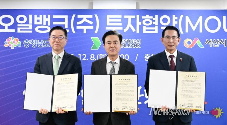 김태흠 지사는 8일 도청 상황실에서 이완섭 서산시장, 송명준 HD현대오일뱅크 대표이사와 투자양해각서(MOU)를 체결했다.