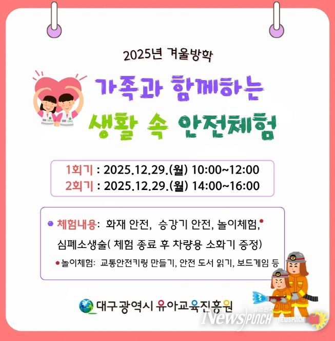 뉴스펀치 조평훈 기자 | 대구유아교육진흥원은 겨울방학을 맞아 12월 29일 안전체험관에서 유아 가족의 안전한 방학생활을 지원하고 안전의식을 높이기 위한 ‘겨울방학, 가족과 함께하는 생활 속 안전체험’을 운영한다.
