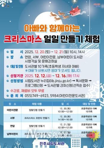 뉴스펀치 김길룡 기자 | 진주시립도서관은 ‘아빠와 함께하는 2025년 크리스마스 일일 만들기 체험’ 특강 참가자를 모집한다.