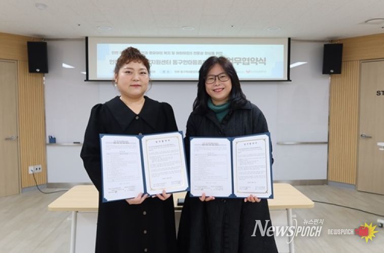 뉴스펀치 김길룡 기자 | 인천 동구육아종합지원센터(센터장 김은선)와 동구한마음종합복지관(관장 이민희)은 지난 5일 영유아의 복지 증진 및 어린이집의 전문성 향상을 위한 업무협약을 체결했다고 밝혔다.