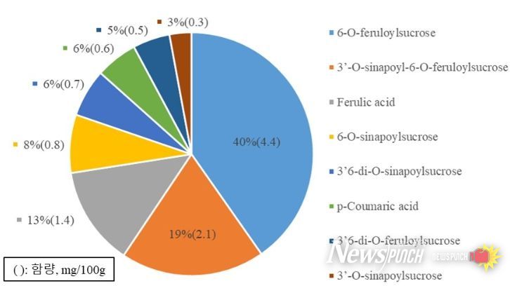 농촌진흥청 식생활영양과 연구진의 정밀 분석 결과, 국산 현미(‘삼광’)에서 총 8종의 페놀산 성분을 확인했으며, 이 중 6종이 배당체 형태로 밝혀졌다. 그 중 ‘6-O-페룰로일슈크로스(6-O-feruloylsucrose)’가 총 페놀산 함량의 약 40%(100g 당 생중량, 4.4mg)를 차지하는 가장 중요한 성분으로 확인됐다. 특히, ‘3′-O-시나포일슈크로스(3′-O-sinapoylsucrose)’는 세계 최초로 현미에서 존재가 확인됐다.