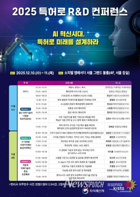 뉴스펀치 조평훈 기자 | 지식재산처는 12월 10일~11일 소피텔 앰배서더(서울 송파구)에서 '2025 특허로 연구개발 학술회의'를 개최한다고 밝혔다. 본 행사는 ‘인공지능 혁신시대, 특허로 미래를 설계하라’를 주제로, 특허 빅데이터를 통해 분석한 국가전략기술의 미래와 구체적인 연구개발 해법을 공유하기 위해 마련됐다.