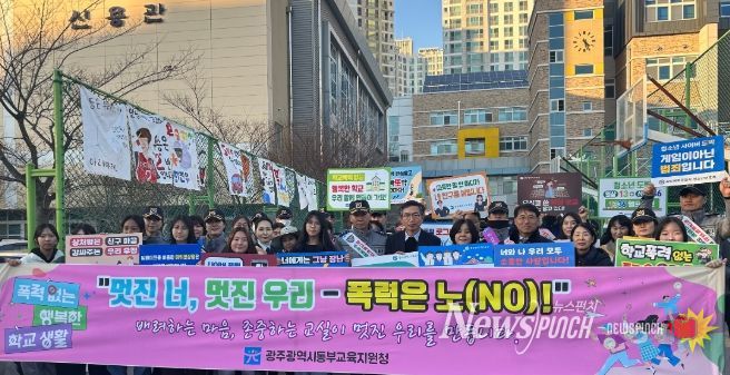 뉴스펀치 김길룡 기자 | 광주광역시동부교육지원청이 지난 9일 오후 4시 30분부터 북구 신용중학교와 신용동 일대에서 지역사회 유관기관과 함께 ‘찾아가는 학교폭력 예방 캠페인’을 실시했다.