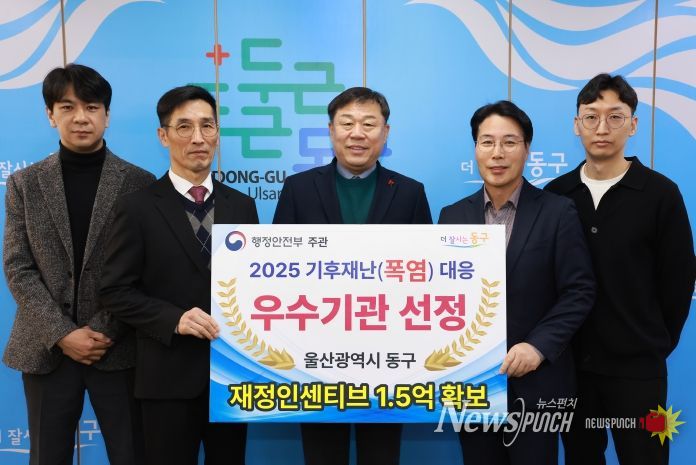 뉴스펀치 김길룡 기자 | 울산 동구는 행정안전부 주관 2025 기후 재난(폭염) 대응 평가에서 ‘우수 지자체’로 선정되어, 기관 표창과 함께 1억 5천만 원의 재정 인센티브를 받게 됐다.
