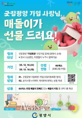 총 60개 업체를 추첨해 12월 22일 굿잡광양 누리집에 결과를 게시하며, 당첨 기업에는 매돌이 장패드 또는 매돌이 키링 중 1종이 제공된다.