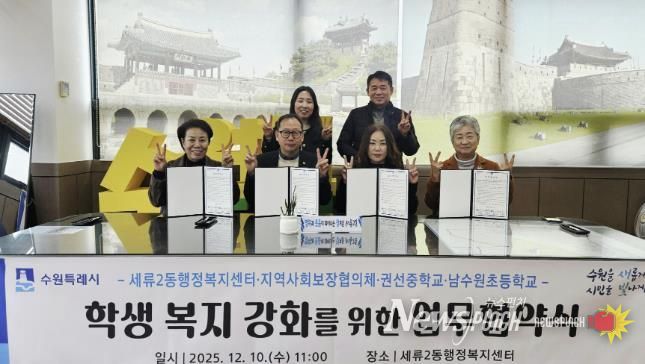 뉴스펀치 김길룡 기자 | 지난 10일 세류2동 학생 복지 강화를 위해 세류2동 행정복지센터 및 지역사회보장협의체·권선중학교·남수원초등학교 간 상호협력을 위한 업무 협약을 체결했다.