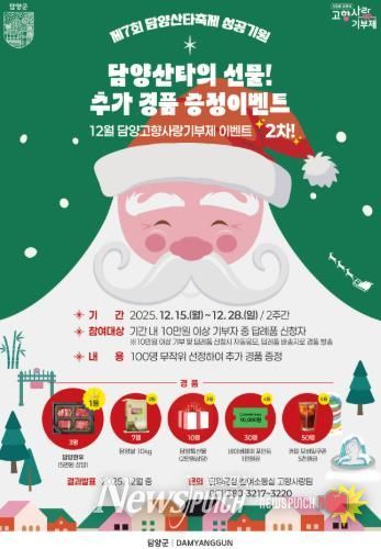 군 관계자는 “제7회 담양산타축제의 성공을 기원하고 연말 고향사랑기부 참여를 높이기 위해 추가 이벤트를 마련했다”며 “담양을 사랑하는 많은 분들의 관심과 참여를 부탁드린다”고 말했다.