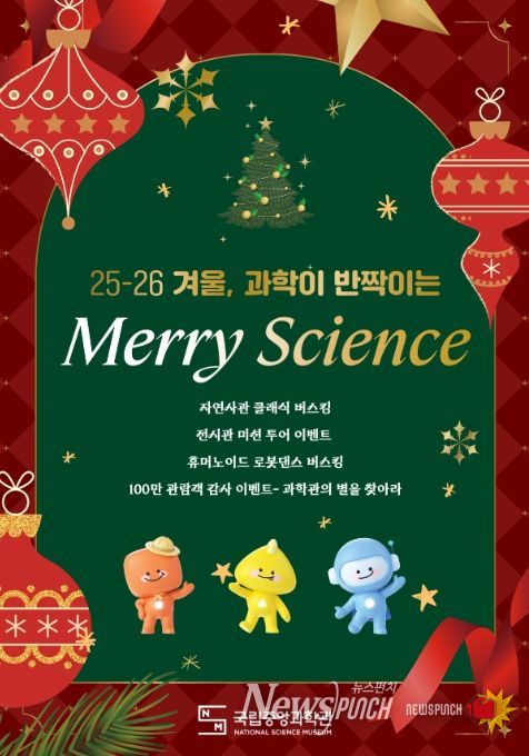 뉴스펀치 조평훈 기자 | 과학기술정보통신부 국립중앙과학관은 2025년 개관 80주년의 마지막을 관람객과 함께 따뜻하게 마무리하고 올 한 해 100만 관람객 달성의 기쁨과 감사를 전할 겨울철 특별행사 '2025-2026 겨울, 과학이 반짝이는 Merry Science'를 12월 13일부터 31일까지 개최한다고 밝혔다.