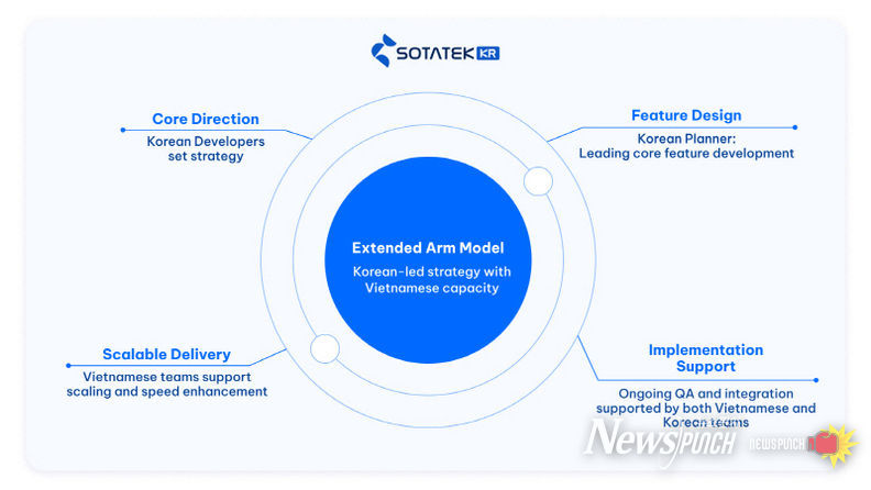 전통적으로 명확한 문서와 고정된 요구사항을 우선하는 방식과 달리, SotaTek Korea는 "Korean Hybrid Delivery" 모델을 구축했다. 이 모델에서 한국인 개발자·기획자·디자이너가 지속적으로 변경되는 요구사항과 고객과의 직접 커뮤니케이션이 필요한 핵심 업무를 담당한다. 반면, 베트남 개발자는 보다 안정적인 영역을 중심으로 ‘extended arm’ 역할을 수행하며 한국 팀의 역량을 확장하는 데 기여한다.