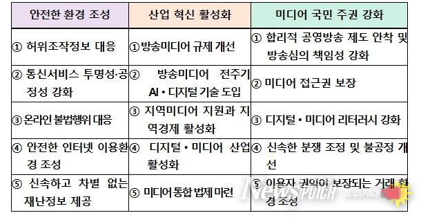 3대 분야는 ▲안전한 방송미디어통신 환경 조성 ▲규제와 진흥의 조화를 통한 산업혁신 활성화 ▲미디어 국민주권 강화이다.