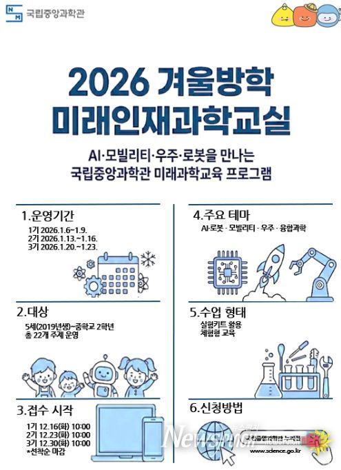 참가신청은 국립중앙과학관 누리집에서 온라인 선착순으로 가능하다. 겨울방학 과학교실은 12월 16일 10시부터, 미래과학캠프는 12월 18일 10시부터 접수할 수 있다.
