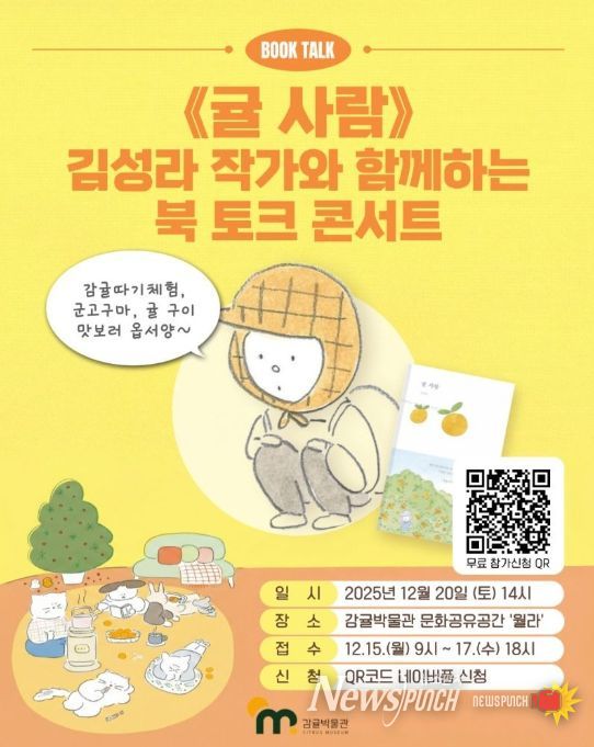 뉴스펀치 김길룡 기자 | 서귀포시 감귤박물관은 개관 20주년을 맞아 오는 12월 20일 오후 2시 문화공유공간 ‘월라’에서 '귤 사람'의 저자 김성라 작가를 초청해 북 토크 콘서트를 개최한다. 이번 행사는 감귤박물관 대중문화 강좌 사계(四季) 겨울 편으로, 제주 감귤을 주제로 한 문학과 감성 이야기를 나누며 주민과 관광객이 함께하는 겨울 문화 프로그램이다.