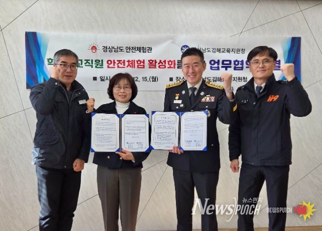 뉴스펀치 김길룡 기자 | 경상남도 소방본부(본부장 이동원)는 15일 경상남도 안전체험관과 김해교육지원청이 업무협약(MOU)을 체결하고, 지역 학생들의 안전의식 제고와 위기 대응 능력 향상을 위한 긴밀한 협력체계를 구축했다고 밝혔다.