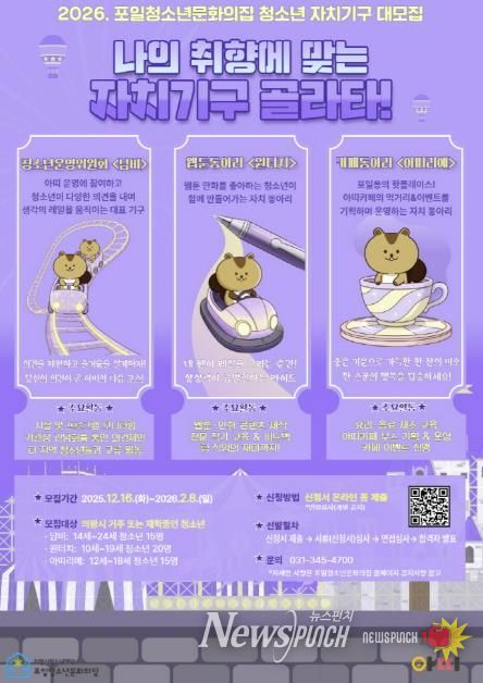 뉴스펀치 김길룡 기자 | 의왕시청소년재단 포일청소년문화의집에서 2026년도 청소년 자치기구(▲청소년운영위원회, ▲웹툰동아리, ▲카페동아리)에 참여할 청소년을 12월 16일부터 2026년 2월 8일까지 모집한다.