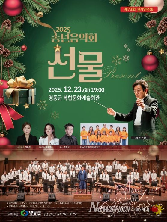 뉴스펀치 김길룡 기자 | 충북 영동군은 오는 23일 오후 7시, 복합문화예술회관에서 2025 송년음악회 ‘선물(Present)’을 개최하고 군민들을 공연장으로 초청한다.