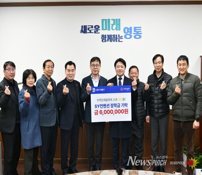 뉴스펀치 김길룡 기자 | 수원시 영통구는 지난 15일, SY컨벤션이 경제적으로 어려운 학생들을 지원하기 위해 장학금 600만 원을 기탁했다고 밝혔다.