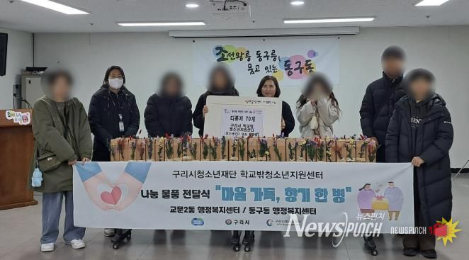 뉴스펀치 김길룡 기자 | 구리시청소년재단 학교밖청소년지원센터는 지난 12월 15일, 학교 밖 청소년들과 함께 교문2동과 동구동 행정복지센터를 방문해 지역 내 홀로 어르신들을 위한 나눔 물품(디퓨저) 100개를 전달했다고 밝혔다.