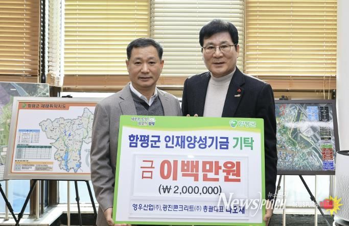 함평군은 16일 “영우산업㈜·광진콘크리트㈜에서 지난 15일 인재양성기금에 200만 원을 기탁했다”고 밝혔다.