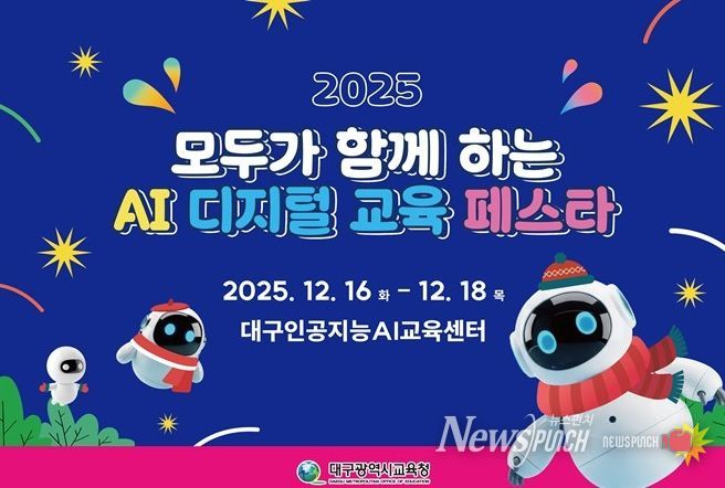 뉴스펀치 조평훈 기자 | 대구시교육청은 12월 16일부터 18일까지 3일간 대구인공지능교육센터에서 초등학교 5·6학년과 중학교 1학년 학생 600여 명을 대상으로 ‘2025 모두가 함께하는 AI 디지털 교육 페스타’를 개최한다.