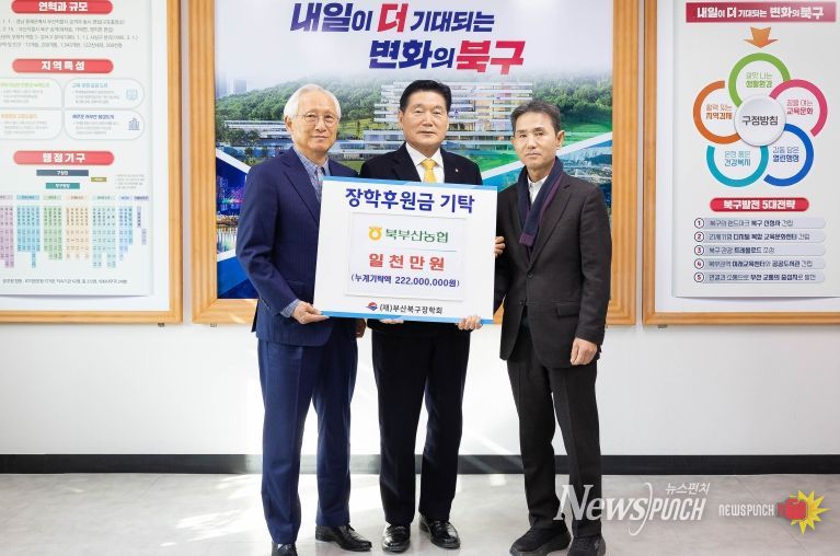 뉴스펀치 김길룡 기자 | 부산 북구는 북부산농협(조합장 이승걸)이 지역 인재 육성과 교육 복지 향상을 위해 (재)부산북구장학회에 장학기금 1천만 원을 기탁했다고 밝혔다.
