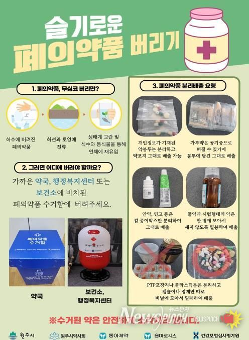 뉴스펀치 김길룡 기자 | 원주시는 가정에서 배출되는 유통기한 지난 폐의약품을 안전하게 처리하기 위하여 올바른 분리배출 방법 홍보에 나섰다.