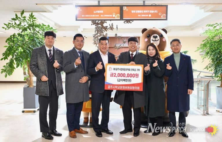 뉴스펀치 김길룡 기자 | 공주시학교운영위원장협의회(회장 오재원)는 지역 인재 육성을 위해 (재)공주시한마음장학회(이사장 최원철)에 장학금 200만 원을 지난 16일 기탁했다고 밝혔다.