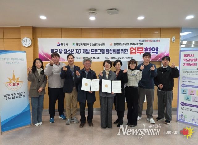 뉴스펀치 김길룡 기자 | 통영시는 지난 15일 통영시청 제2청사 회의실에서 학교 밖 청소년 자기개발 프로그램 지원 강화 및 활성화를 위해 통영시학교밖청소년지원센터(센터장 유정옥)와 한국해양소년단경남남부연맹(연맹장 김정명) 간 업무협약을 체결했다고 밝혔다.