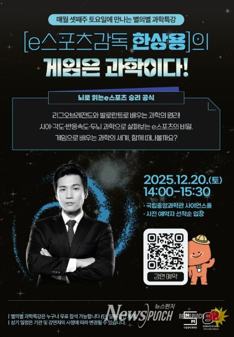 뉴스펀치 조평훈 기자 | 과학기술정보통신부 국립중앙과학관은 12월 20일 오후 2시, 매월 셋째 주 토요일에 열리는 ‘별의별 과학특강’의 12월 강연자로 오산대학교 e스포츠학과 한상용 교수를 초청해 '게임은 과학이다'라는 주제의 강연을 개최한다고 밝혔다.