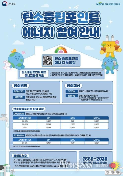 탄소중립포인트제는 가정에서 전기·수도·가스 사용량을 절감하거나 자동차 운행거리를 줄일 경우, 그 실적에 따라 포인트를 적립해 인센티브로 환급하는 제도다. 시민이 일상생활 속에서 손쉽게 참여할 수 있는 생활밀착형 탄소중립 정책으로 자리매김하고 있다.